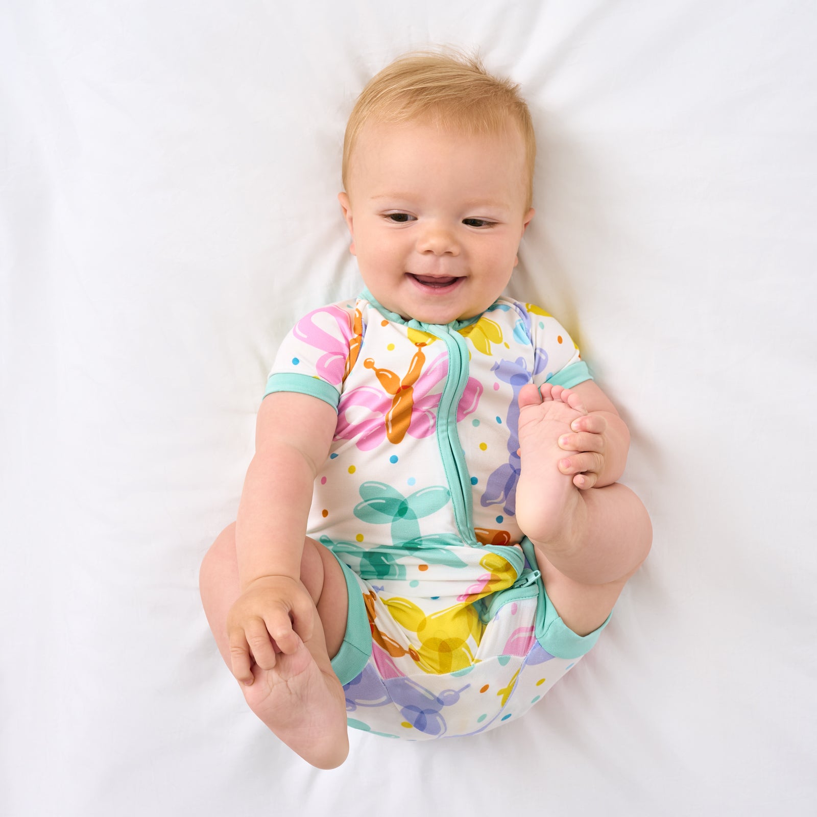 Cue the confetti! The Balloon Bash Shorty Zippy features floaty friends in pastel hues. Made from buttery soft and gentle Lunaluxe? Bamboo. this sweet sleeper is perfect for birthday snuggles or post-party snoozes. With a convenient double zipper. it makes every day feel like a party. Grab it in matching jams for the whole fam!
