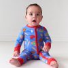Step up to the plate with our All Stars Zippy. made for your future MVP. This sporty print features gloves. bats. baseballs. stadium snacks. and more! The classic blue background with pinstripes and bright red trim brings major league vibes. Crafted from our signature Lunaluxe® Bamboo. it includes game-winning details like fold-over feet & mittens. a 2-way zipper for quick changes. and no scratchy tags. Grab both colorways for sibling matching moments!