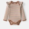 An anytime essential. The Chestnut Brown Stripe Flutter Bodysuit is made from soft. durable bamboo with a snug fit. This adorable newborn bodysuit features lap shoulders for easy dressing and fold-over mittens to protect delicate skin from tiny scratches. The flutter details at shoulders add a photo-worthy touch. while snap closures make diaper changes easy.