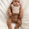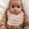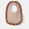Perfect for messy milestones. teething days. and all the adorable chaos in between! The Chestnut Brown Stripe Ruffle Bib is made from absorbent bamboo viscose. complete with terry backing. This newborn bib catches every drool and spill while keeping baby looking sweet. The snaps adjust as they grow. while ruffle edge details make everyday moments photo-worthy.