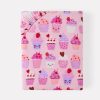Cupcake Kisses is light pink and features pink. purple. and white frosted cupcakes adorned with cherries. strawberries. chocolate. hearts. and sprinkles. Some cupcakes feature sleepy and smiley faces.