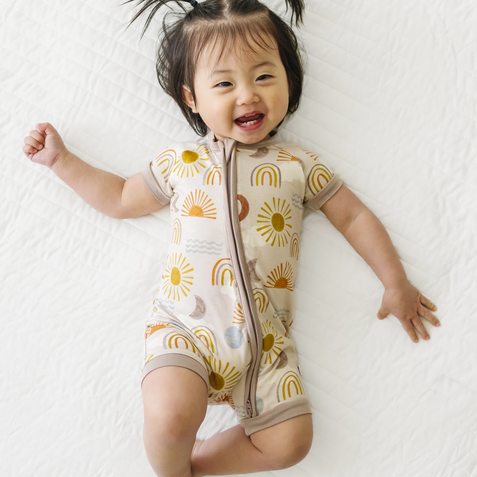 Good morning. sunshine! This one-piece zipper pajama features dreamy celestial motifs in muted shades of brown & blue. Made from our signature Lunaluxe® Bamboo. with thoughtful features like a double-zipper that extends down the leg & no scratchy tags. It’s just perfect for lovers of all things neutral!