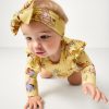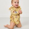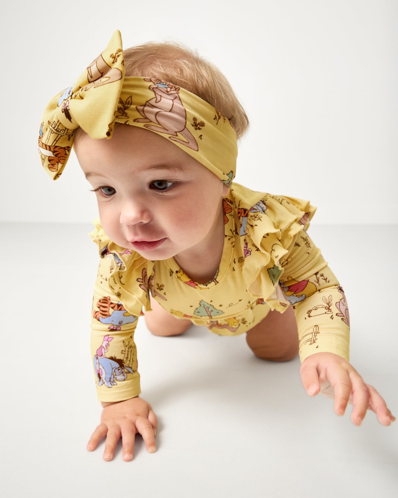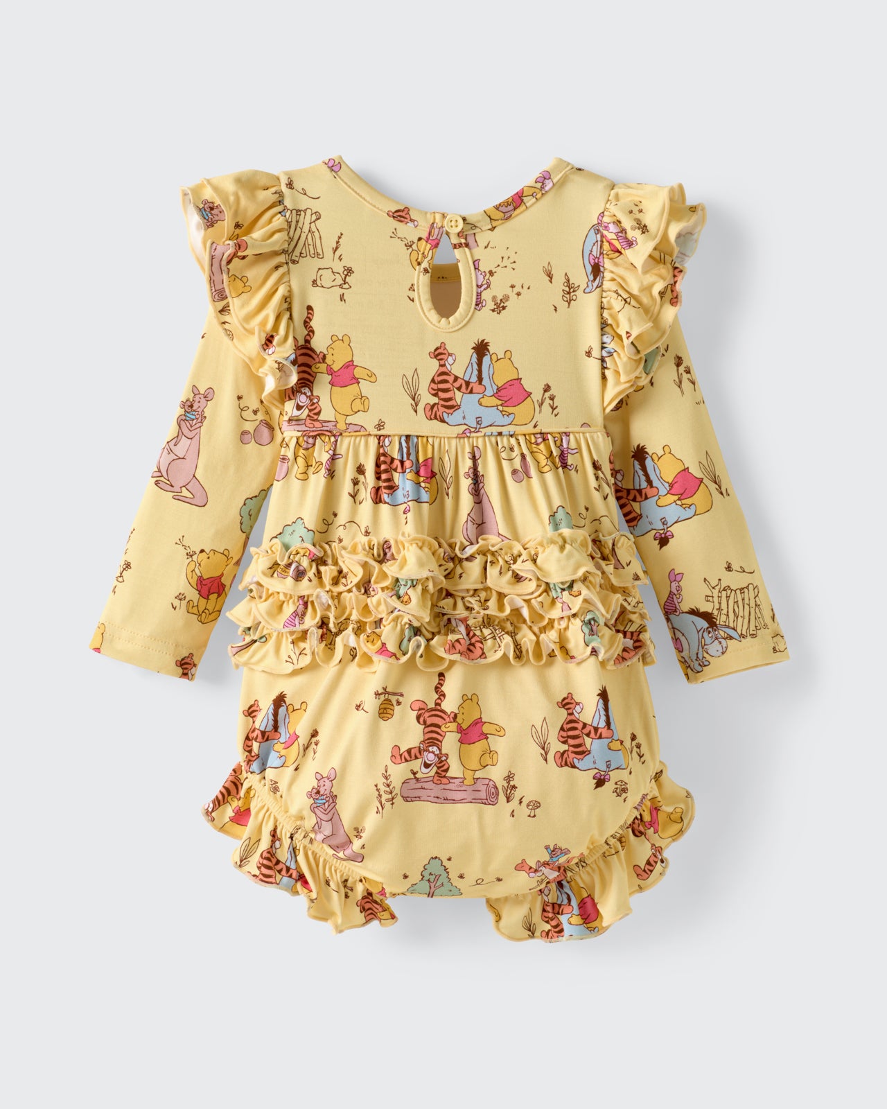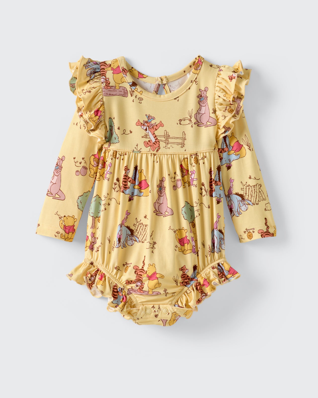 Little sweetie. big adventures! The Disney Playtime With Pooh Bubble Romper features all their fave friends on an updated shade of butter yellow. Made from soft. durable Soluxe? Bamboo. this baby romper has a snappable bottom for easy changes and the cutest ruffle details. Perfect for family outings and sibling matching!