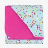 The Friends Forever print features colorful friendship bracelets with phrases such as smile. magic. besties. hugs. xoxo. and more. The background is light aqua blue and the trim and backing are a deep shade of hot pink.
