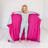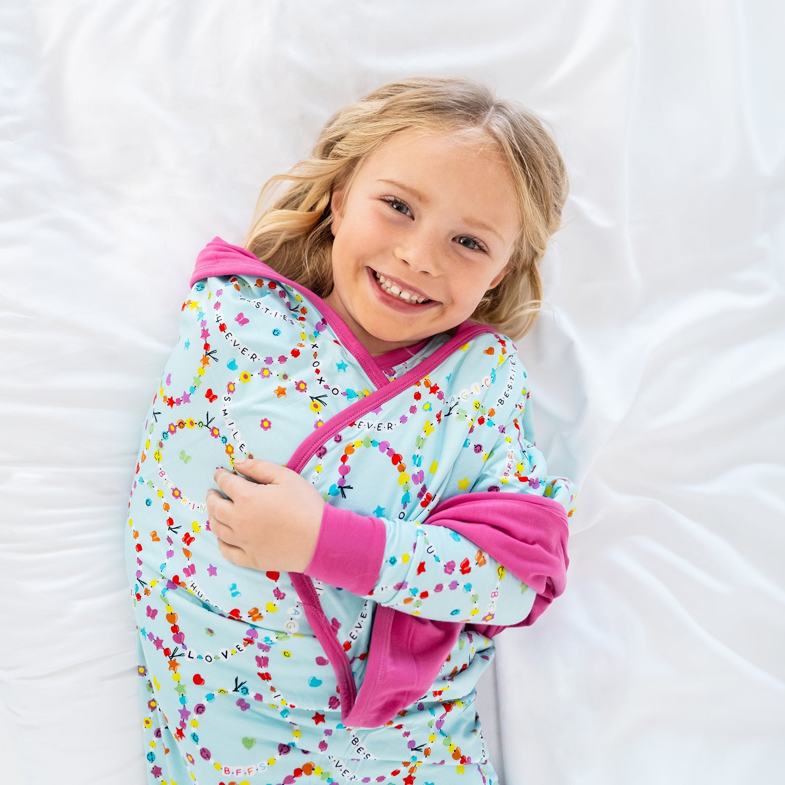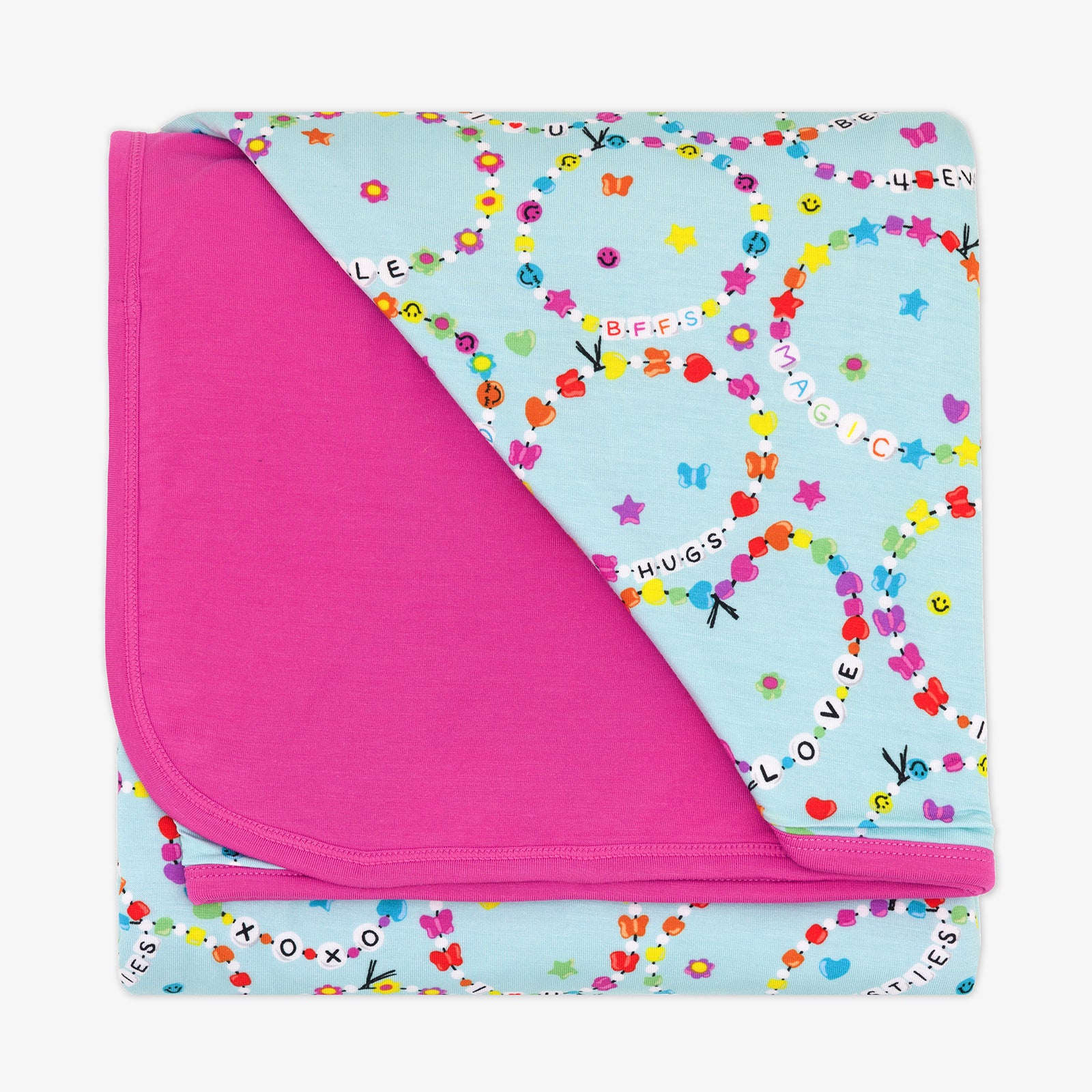 Snuggle up through every era with the Friends Forever Cloud Blanket! Made from triple-layered Lunaluxe? Bamboo. it’s buttery soft. breathable. and perfect for family time on the couch. Featuring a colorful friendship bracelet print and a coordinating shade of pink on the other side. this generously sized blanket brings a touch of enchantment to cozy evenings. Pair with matching PJs!