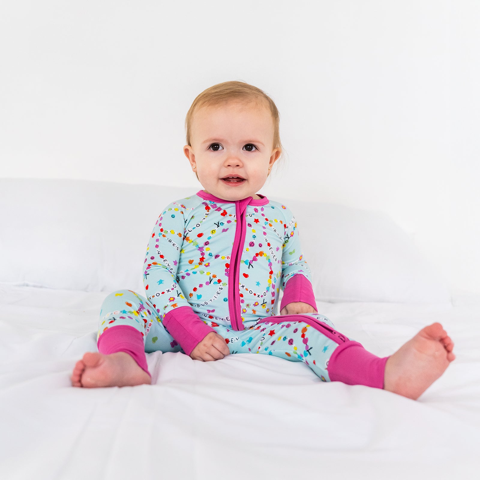 This night is sparkling! Made from buttery soft and seasonless Lunaluxe® Bamboo. this enchanting Zippy is designed with fold-over mittens. foot cuffs. and a double zipper for easy changes. Featuring colorful friendship bracelets and an aqua blue hue. it’s perfect for mommy & me matching.