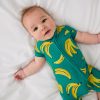 The Go Bananas print features yellow bananas scattered across a teal green print. The trim is matching teal green.