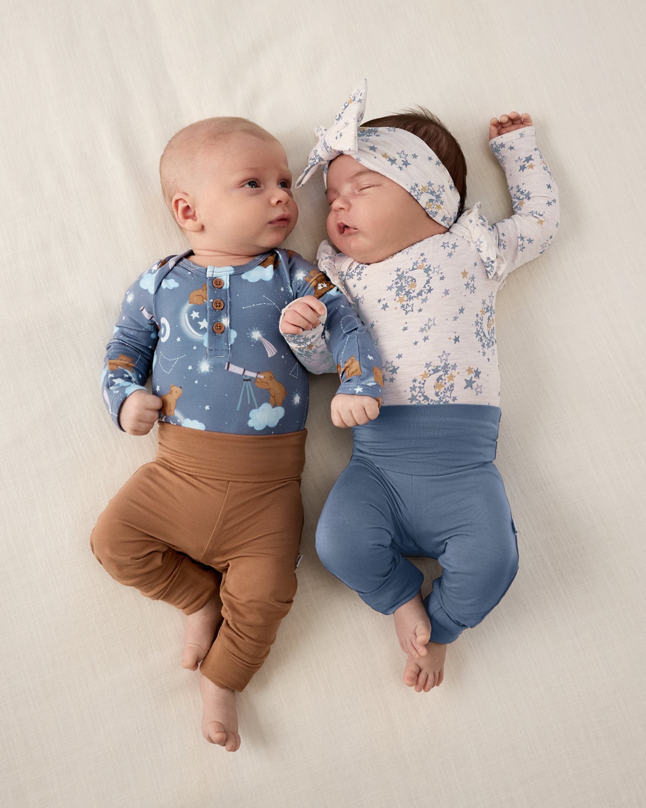 A comfy essential for those precious early days. Our Hazy Blue Fold-Over Leggings are made with durable bamboo. complete with an adjustable fold-over waistband that’s perfect for healing belly buttons. The fold-over foot cuffs keep tiny toes warm. while the tagless design protects even the most sensitive skin. Layer them with the matching Henley Bodysuit!