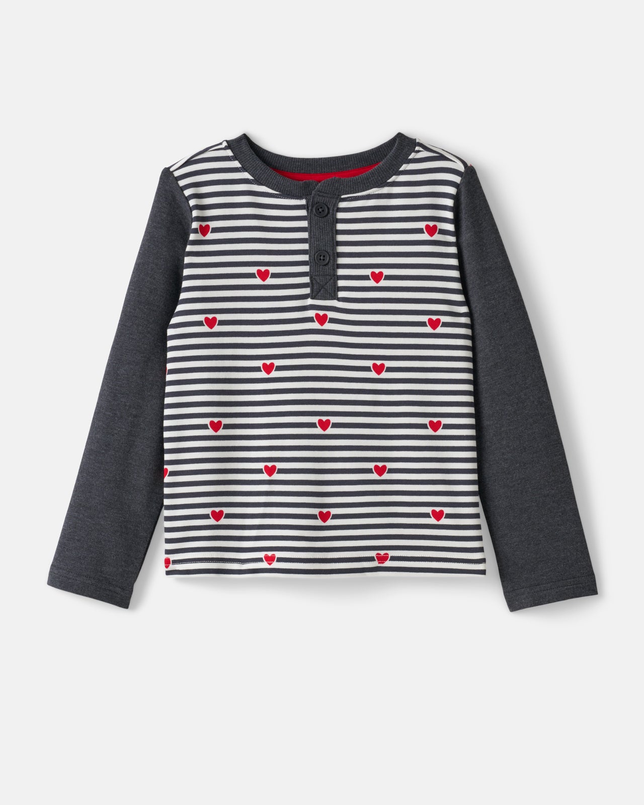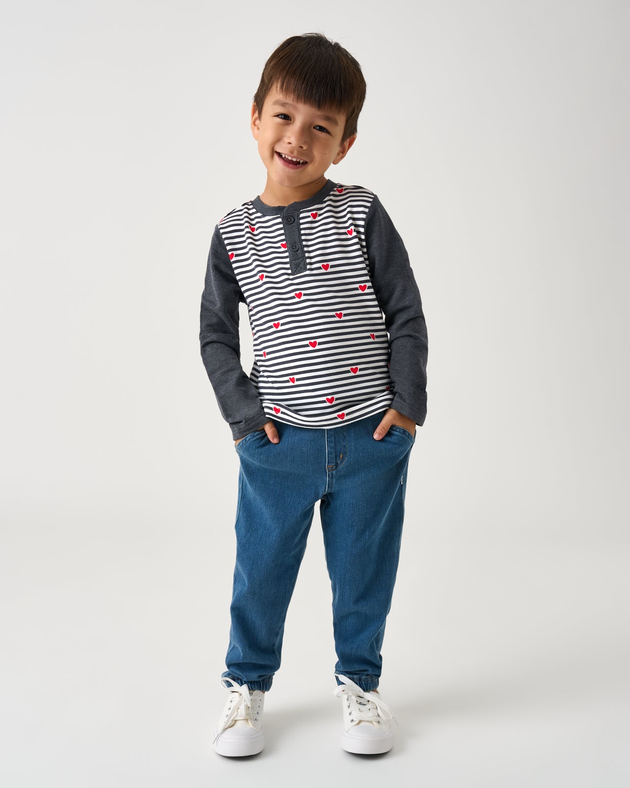 Hey. little heartbreaker! The Heartstrings Stripe Henley Tee features charming stripes with red micro hearts on soft and durable Soluxe® Bamboo. This boys t shirt has a henley neckline with functional buttons and a relaxed fit perfect for playtime. Mix & match with their fave LS bottoms!