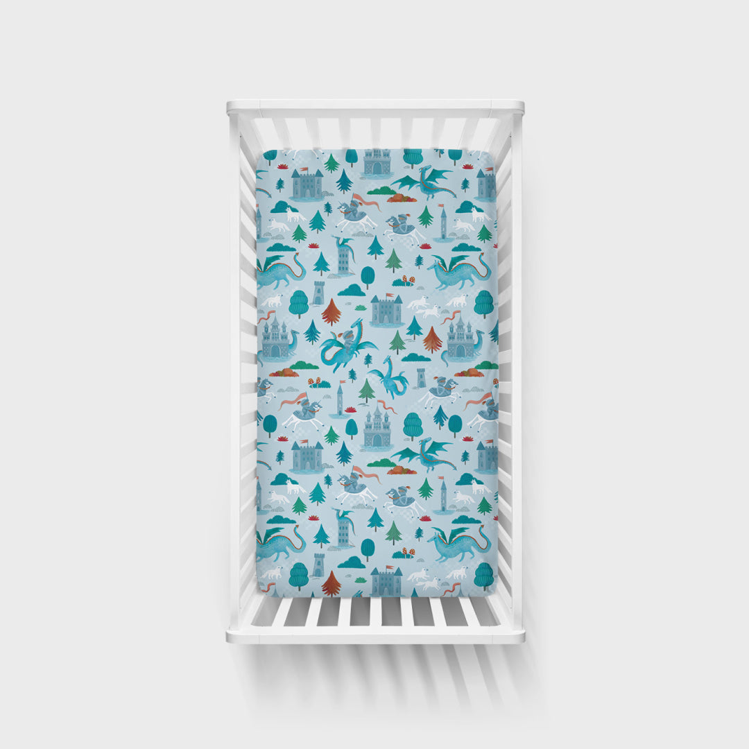 Quest for the sweetest dreams! The Knight’s Quest Fitted Crib Sheet features enchanting knights. dragons. and castles on buttery soft Lunaluxe? Bamboo. This bamboo crib sheet has a fully elasticized fit for safety and security. plus a matching reusable pouch. Don’t forget to grab the matching Zippy!