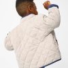 The Linen Heather Quilted Barn Jacket is light heather beige. The trim is faded navy blue and the pockets are caramel.