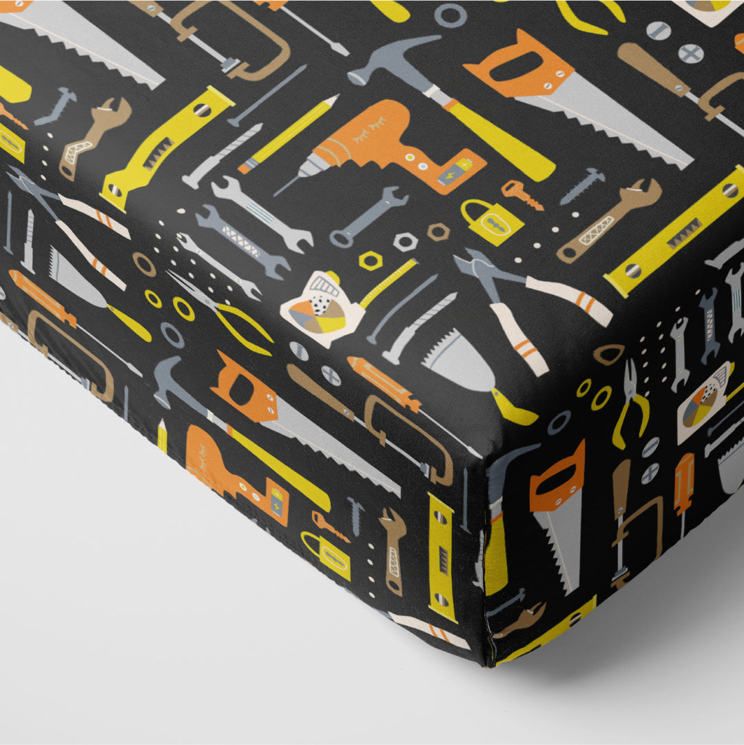 The Little Builders print is filled with colorful tools ?? such as drills. pliers. wrenches. and more ?? neatly arranged across a black background.