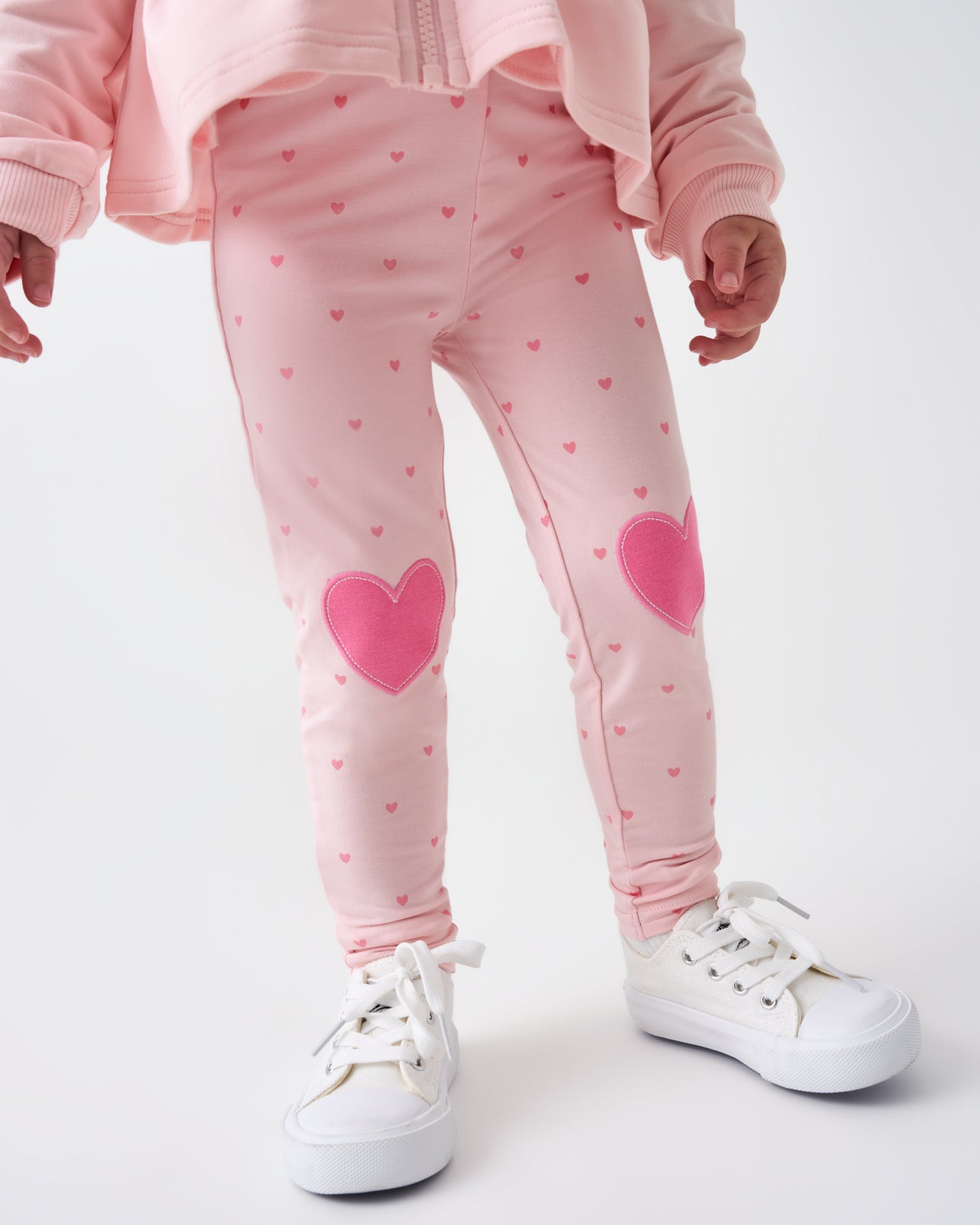 Fall in love with the little things! The Little Love Heart Patch Legging features a rosy pink micro hearts print with adorable heart patches at the knees. Made from durable Soluxe® Bamboo. these girls leggings have a slim fit with live-in comfort and an easy pull-on style. Pair with the Little Love Flare Zip Hoodie for head-to-toe sweetness!