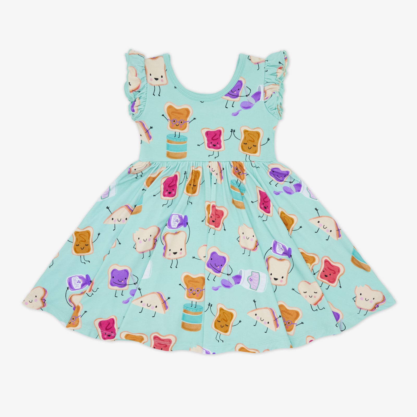 Twirl into lunchtime! This girls’ dress features the sweetest spreads and breads. with special details she’ll love. Made from super soft and durable Soluxe® Bamboo. it’s got flutter sleeves. a full twirl skirt. and two side pockets for storing snacks. Perfect for playground adventures and matching moments with best buds!