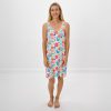 Midsummer Meadow is white and filled with an assortment of flowers in shades of pink. yellow. and blue. The trim is light blush pink.