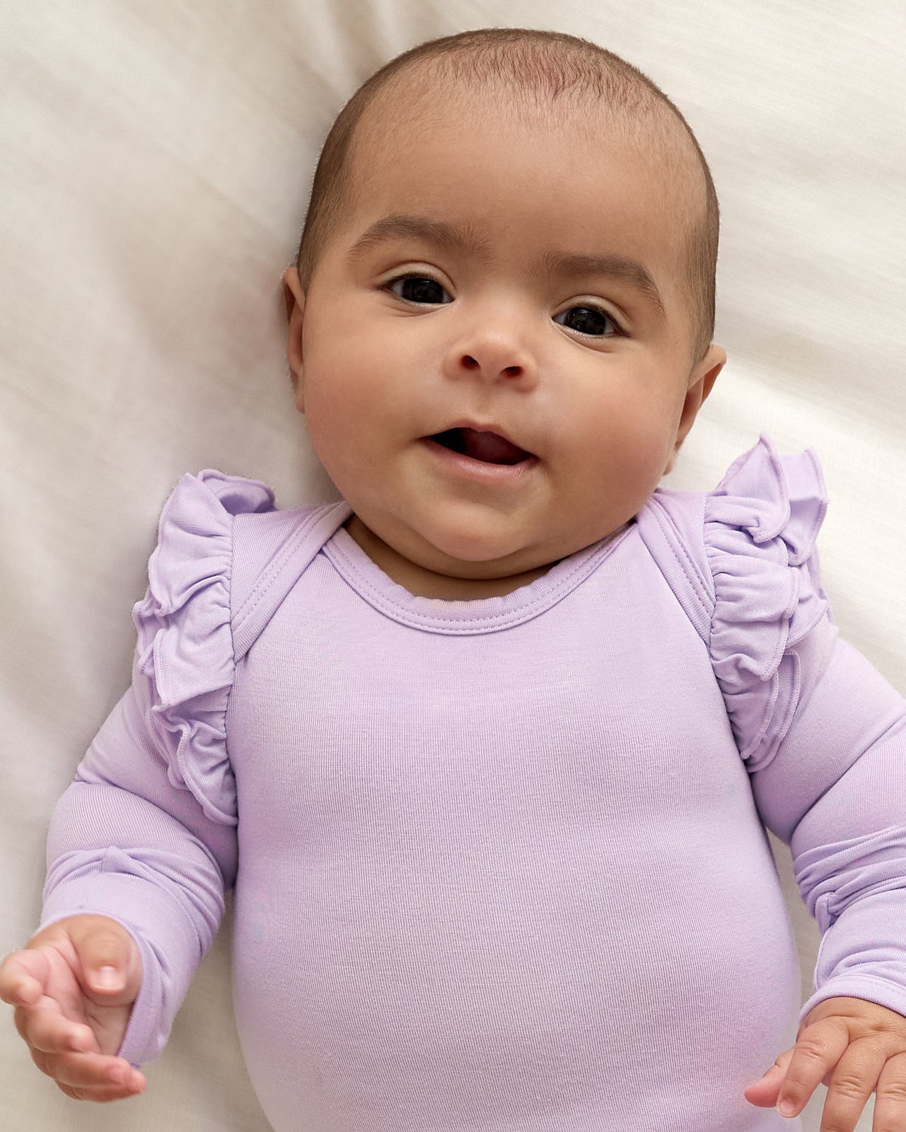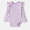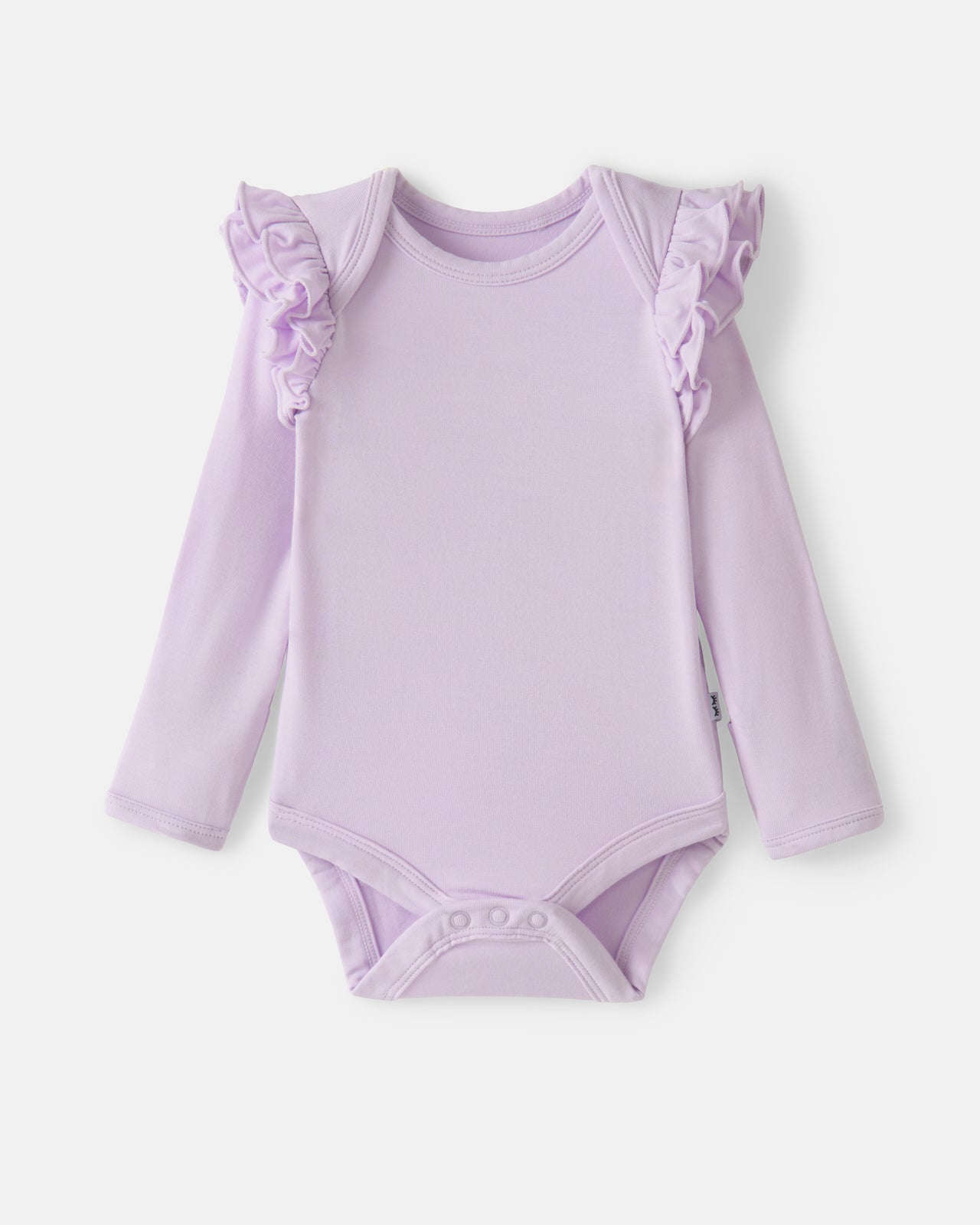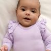 The prettiest anytime essential. The Misty Lavender Flutter Bodysuit is made from soft. durable bamboo with a snug fit. This adorable newborn bodysuit features lap shoulders for easy dressing and fold-over mittens to protect delicate skin from tiny scratches. The flutter details at shoulders add a photo-worthy touch. while snap closures make diaper changes a breeze.