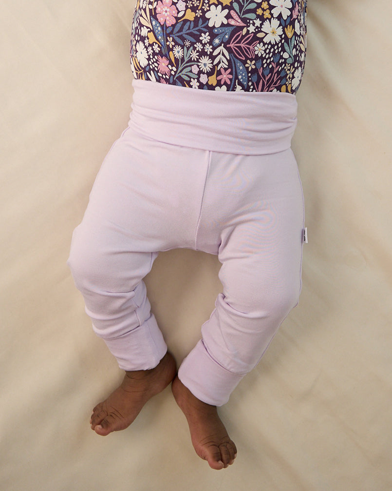 An essential for those precious early days. The Misty Lavender Fold-Over Leggings are made with durable bamboo. complete with an adjustable fold-over waistband that’s perfect for healing belly buttons. The fold-over foot cuffs keep tiny toes warm. while the tagless design protects even the most sensitive skin. Mix & match with other newborn faves!
