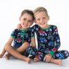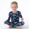 Vroom. vroom! Our first-ever monster truck print features blue. red and green trucks racing across a dark navy background. Look closely to spot fun faces on the trucks inspired by dragons. crocs. sharks and rhinos! Made from buttery soft and stretchy Lunaluxe® Bamboo. these PJs are designed with extra length to fit up-to-3x longer. Snag styles for full family matching!