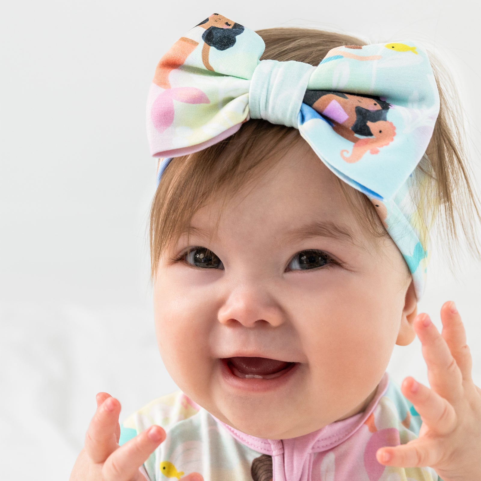 Top off their look with a splash of magic! Our Mystic Mermaids Luxe Bow Headband features a dreamy pastel sea filled with mermaids and marine friends. Made from our signature Lunaluxe® Bamboo. it’s buttery soft. stretchy. and gentle on sensitive skin. With real loops that never need tying. this bow is shore to stay picture-perfect from playtime to dreamtime ??because every little mermaid deserves a crowning touch to their favorite outfit! We love it paired with matching jammies. but it looks just as cute with a solid pink or white look.