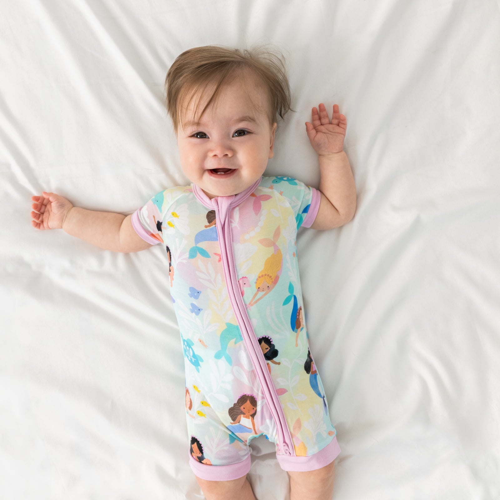 Make a splash at bedtime with the Mystic Mermaids Shorty Zippy! Made from buttery soft Lunaluxe® Bamboo. it’s breathable. gentle on sensitive skin. and just right for warmer nights. A double zipper makes changes a breeze. and the tagless design adds extra comfort. Featuring mermaids and their ocean pals gliding through a swirly pastel sea. this Shorty is a shore bet for sweet dreams!