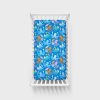 The Octopus Party print features a rainbow of sleepy and smiley octopuses playing with surfboards. pinwheels. and more. They are swimming across an ocean blue background and it is finished with a matching blue trim and pocket.