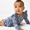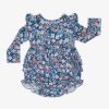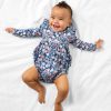 Little blooms. big adventures! The Petite Petals Bubble Romper features tiny florals in soft shades on a dreamy blue-gray backdrop. Made from durable Soluxe® Bamboo. this baby romper has a snappable bottom for easy changes and the sweetest ruffle details. Perfect for autumn outings and sibling matching!
