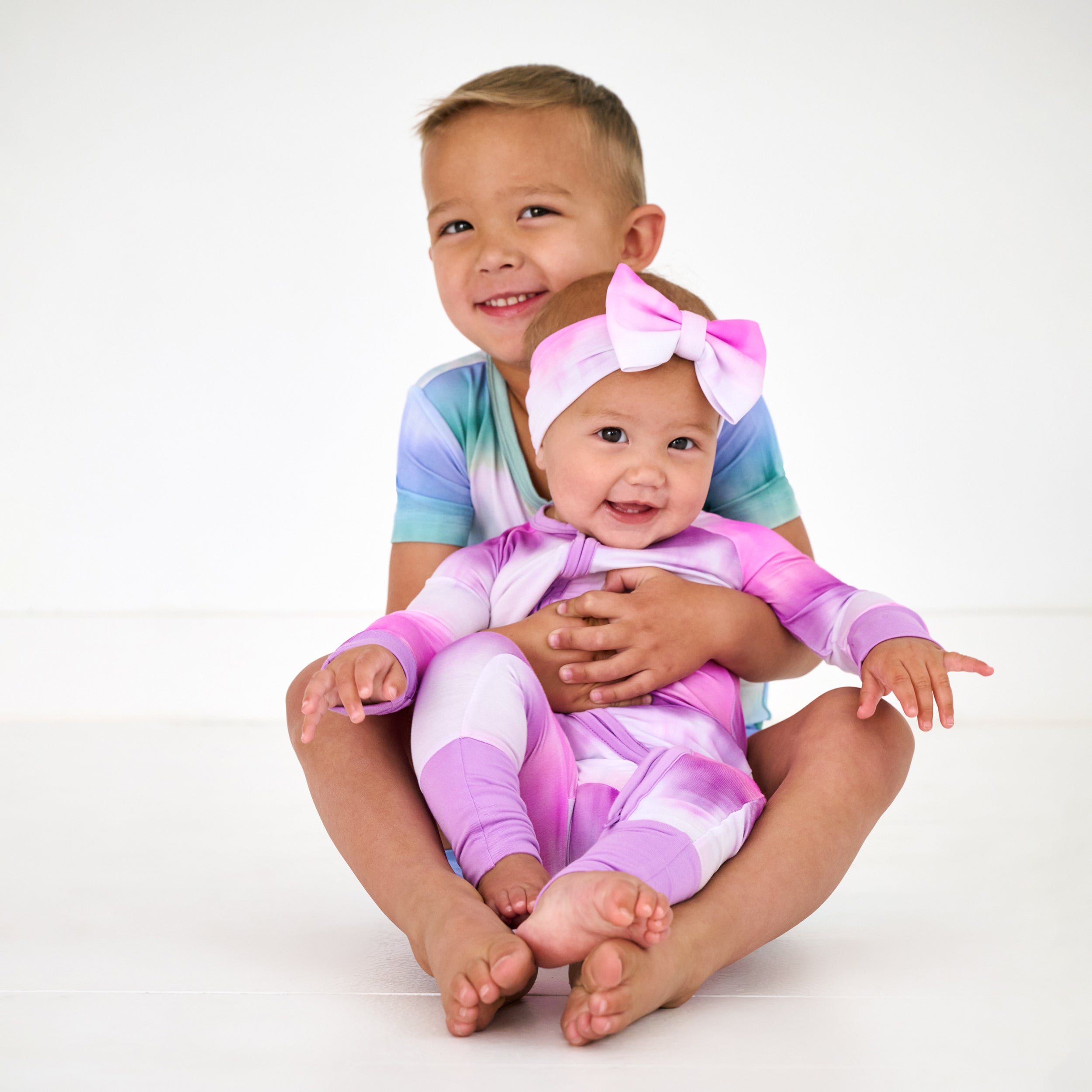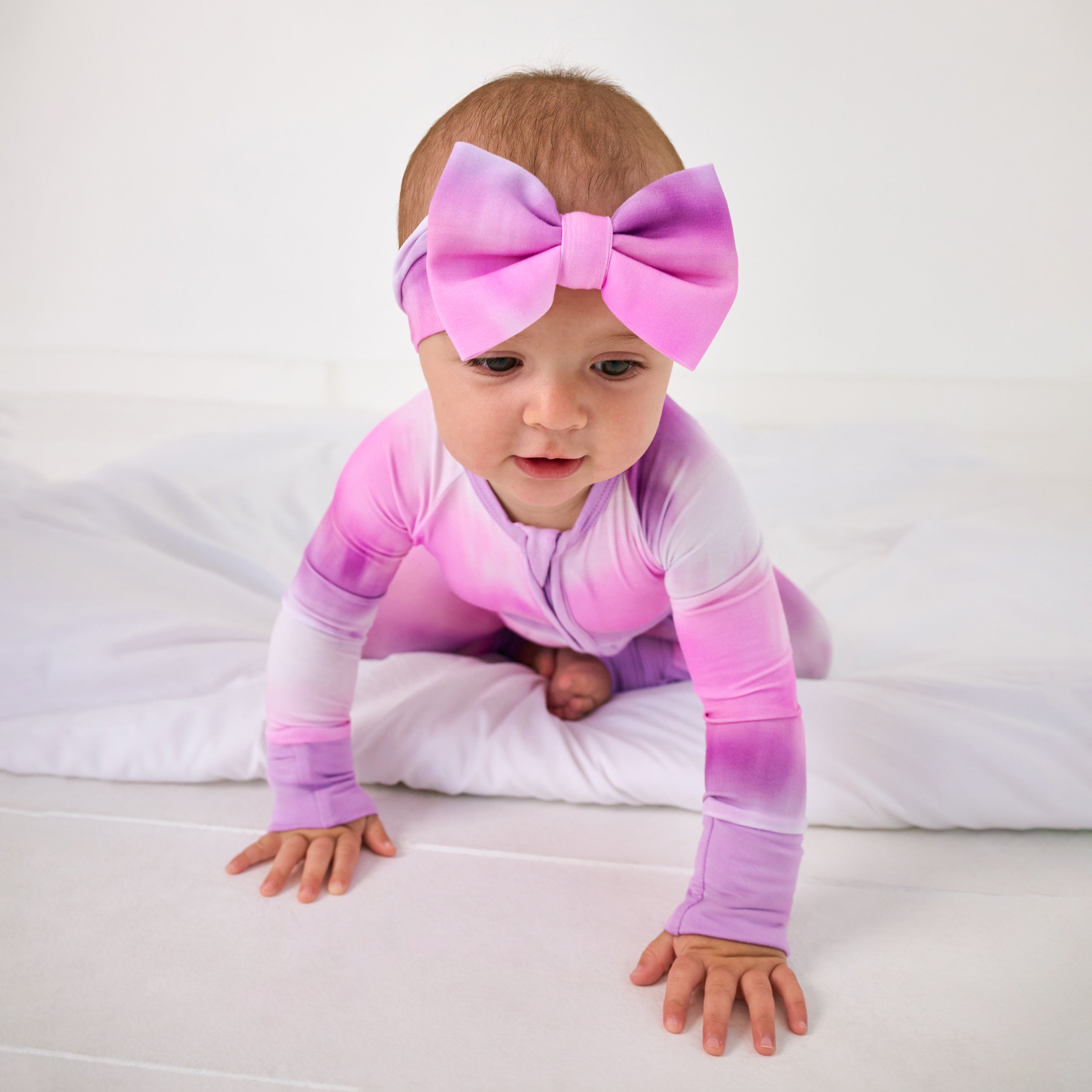 A sweet finishing touch for your cosmic cutie! The Cosmic Mist Luxe Bow Headband brings all the dreamy vibes with its pink ombr?? design. Made from buttery soft Lunaluxe? Bamboo. it features real loops that never need tying. Pair it with the matching Zippy. or mix & match with a solid one-piece pajama!?