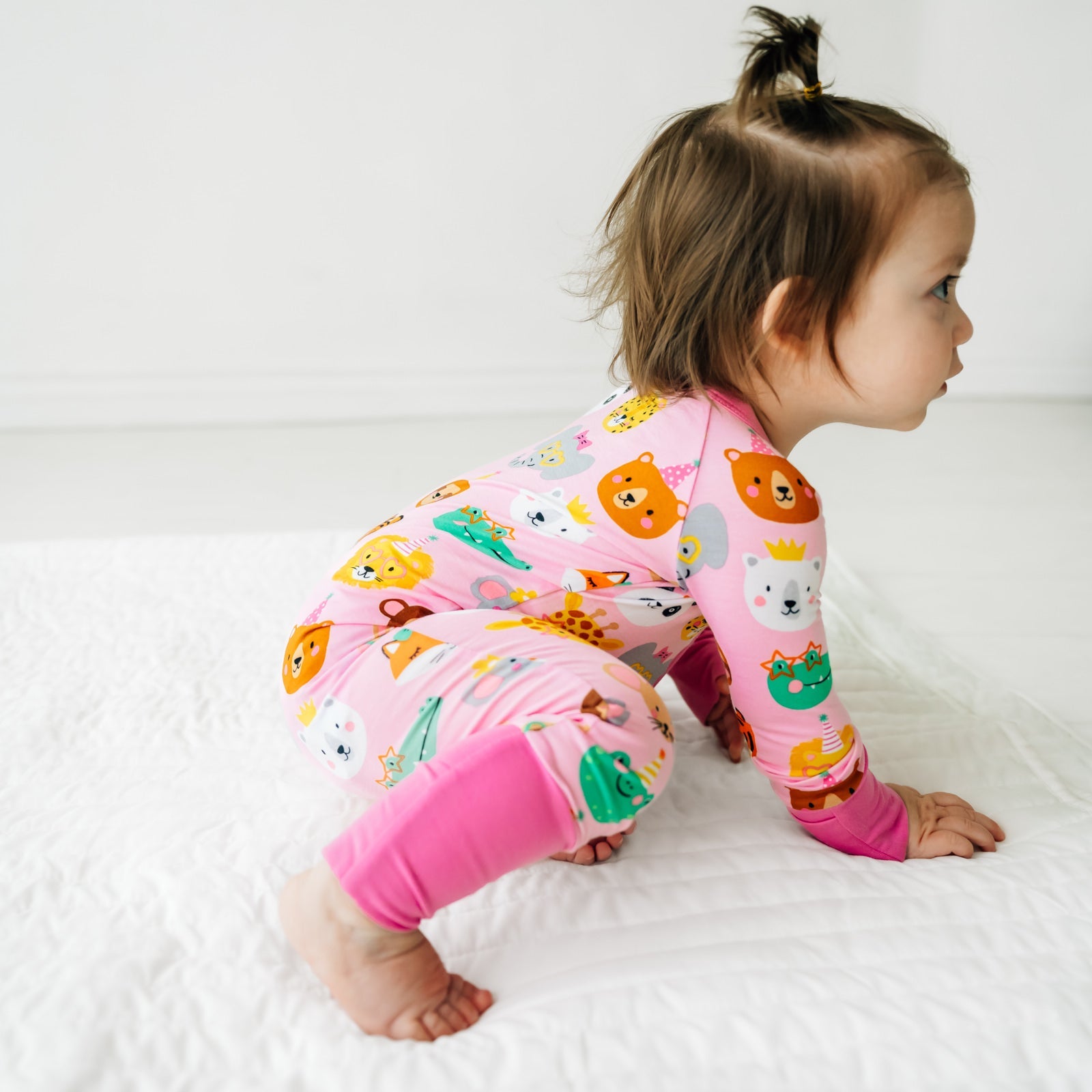 Let’s celebrate! This one-piece zipper pajama features giraffes. monkeys. elephants & more cute creatures that bring the birthday vibes on a pretty pink background. Made from buttery soft Lunaluxe® Bamboo. with thoughtful features like fold-over feet & mittens. a 2-way zipper and no scratchy tags. Just the perfect birthday outfit ??or birthday gift!