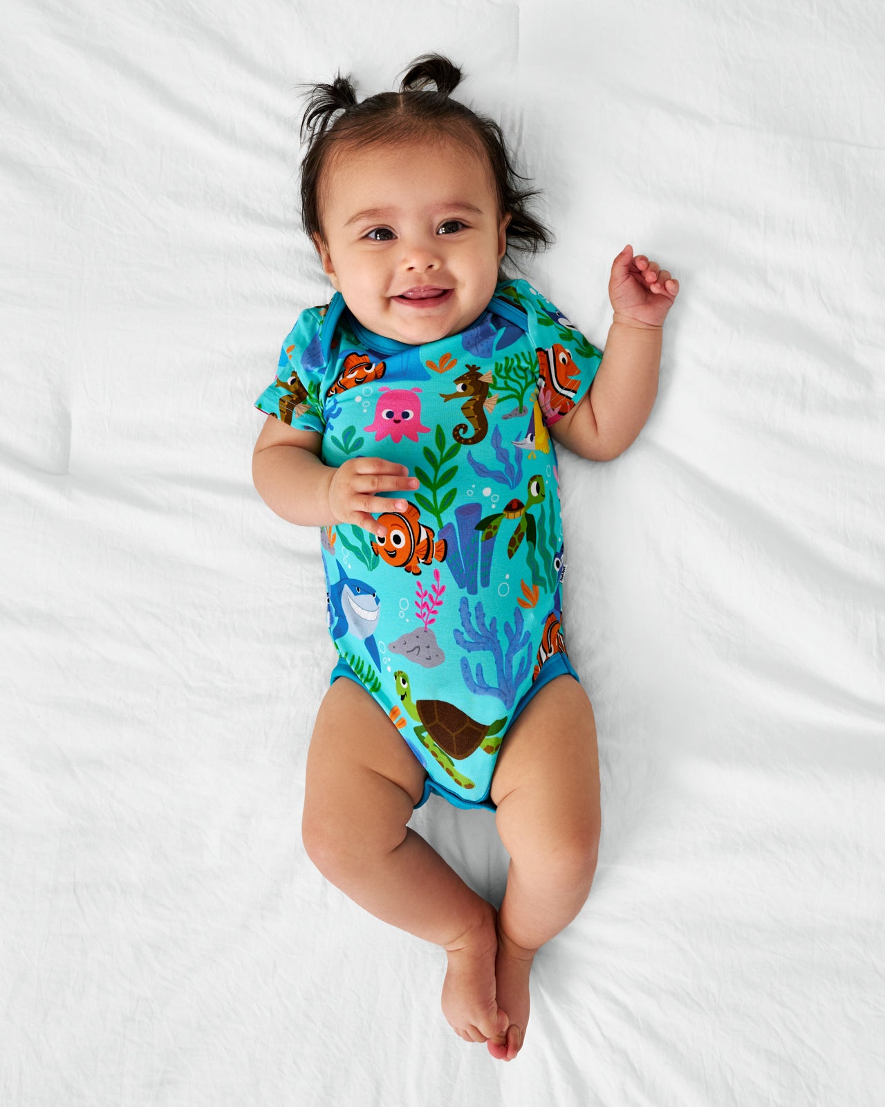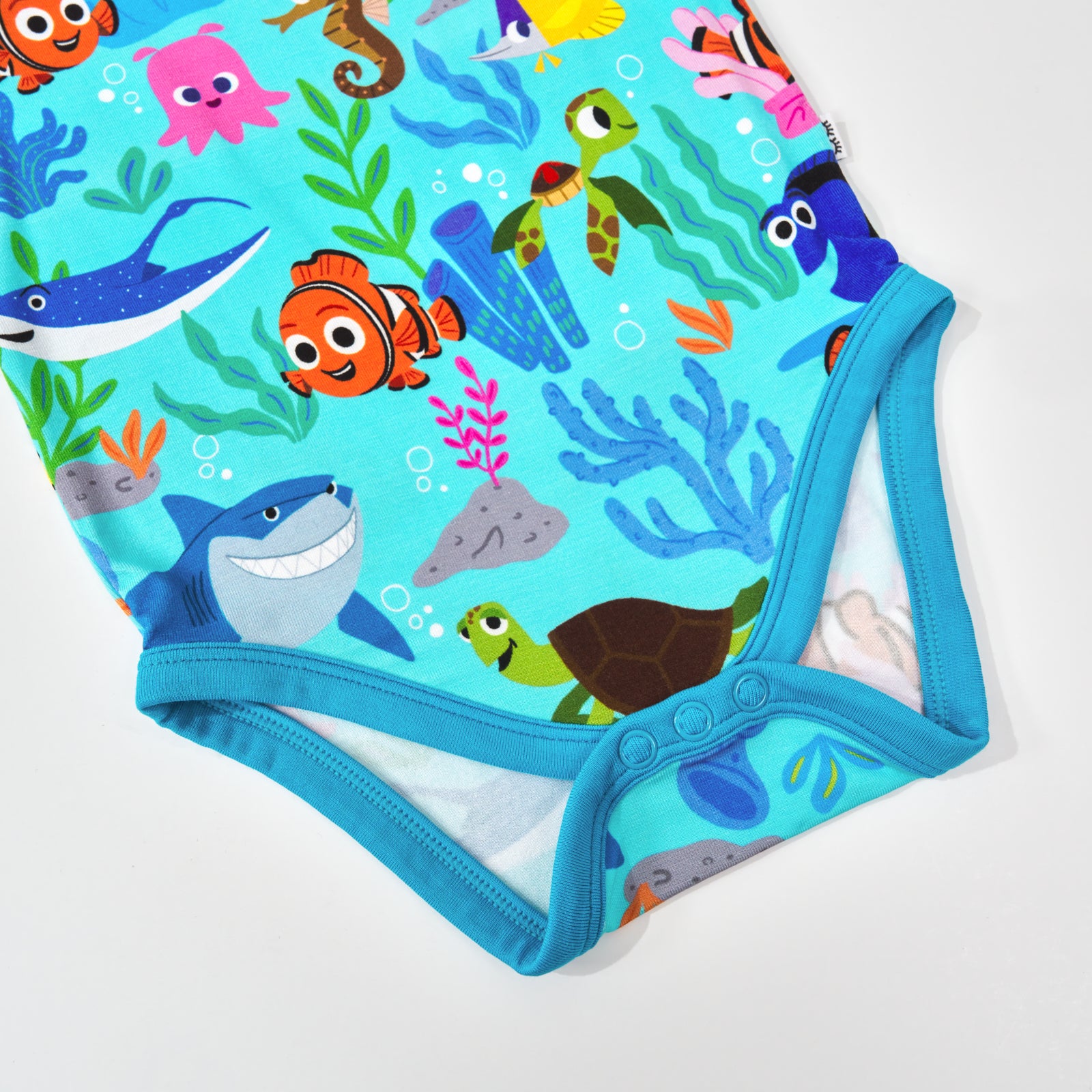 An adorable new one-piece for your little one! The Disney’s Nemo’s Reef Bodysuit features Disney’s Nemo. Dory. and friends in a vibrant underwater scene. made from soft and durable Soluxe? Bamboo. With lap shoulders. a tag-free fit. and built-in snaps for quick diaper swaps. it’s perfect for little explorers on the move. Snuggly soft and gentle on sensitive skin. it’s a must-have for playtime and beyond!