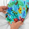 The Disney’s Nemo’s Reef print features Disney’s Nemo. Dory. Crush. and more fan-fave characters swimming through colorful coral on an aqua blue background. The trim is a deeper hue of aqua blue.