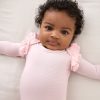 First smiles and coos deserve the sweetest flutter touches! The Prima Pink Stripe Flutter Bodysuit is made from durable Soluxe? Bamboo jersey with a snug fit. This adorable newborn bodysuit features lap shoulders for easy dressing and fold-over mittens to protect delicate skin from tiny scratches. The flutter details at shoulders add a photo-worthy spin. while snap closures make diaper changes easy. Comes in a bamboo keepsake bag that can double as a gift bag!