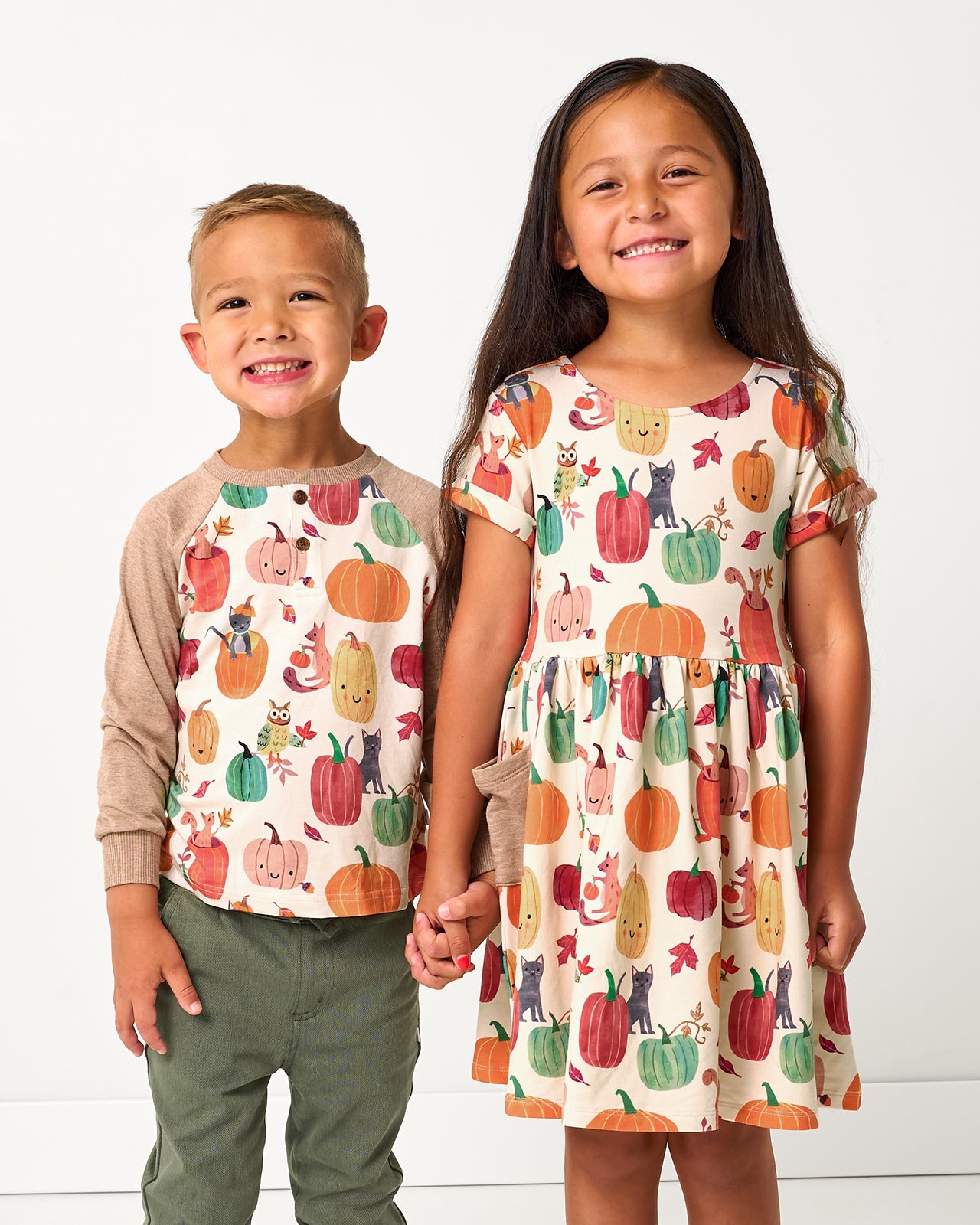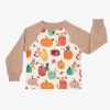 Pumpkin Pals features smiling pumpkins surrounded by black cats. squirrels. and owls across a warm ivory background. The sleeves are heather tan.
