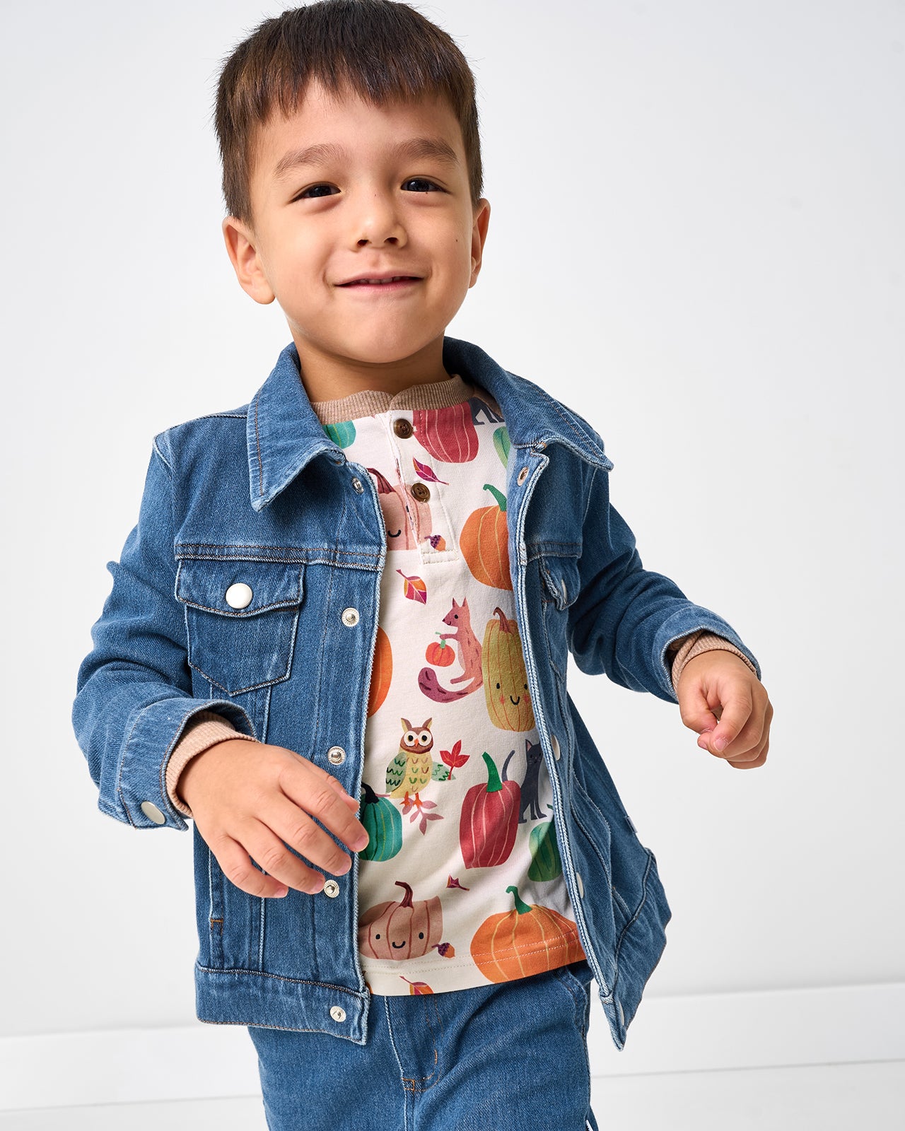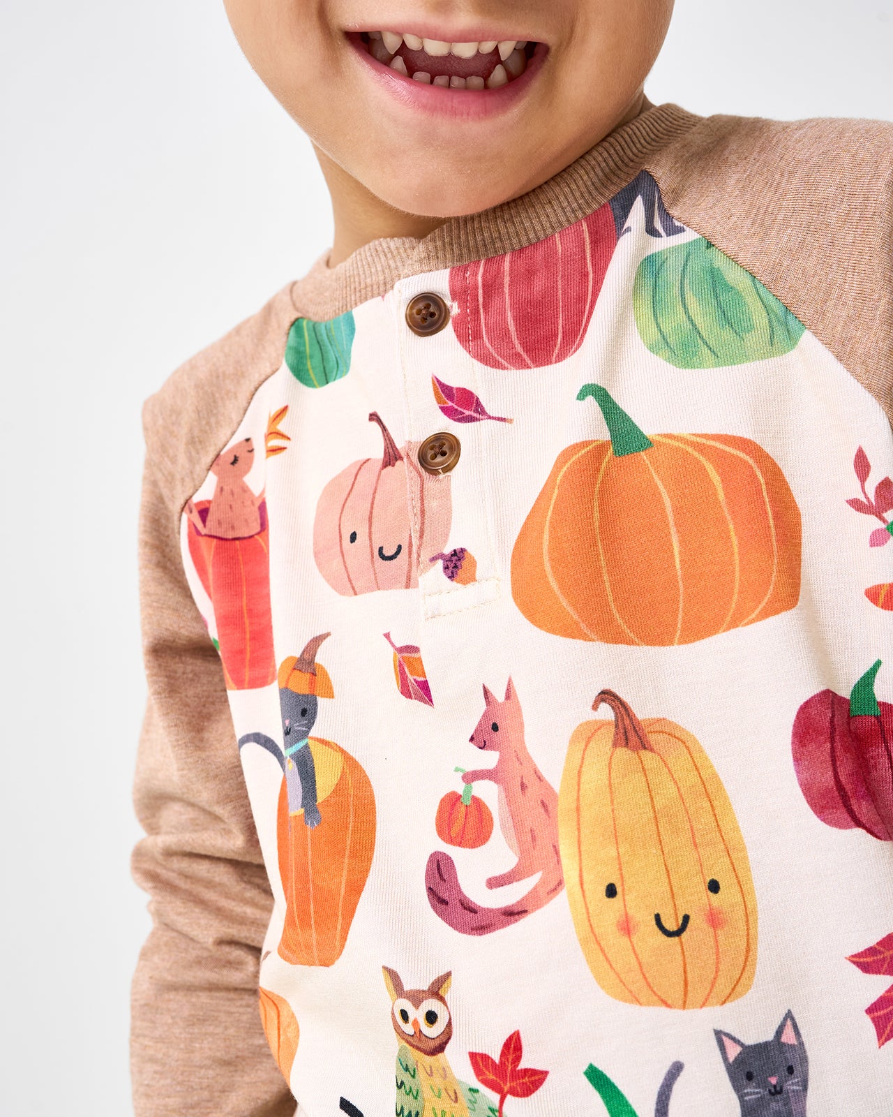 Harvest helper-ready! The Pumpkin Pals Raglan Henley Tee features sweet-faced pumpkins and friends on durable Soluxe? Bamboo. This boys shirt has coloblock raglan sleeves and a comfortable fit perfect for pumpkin patch adventures. Mix & match with their fave LS bottoms!