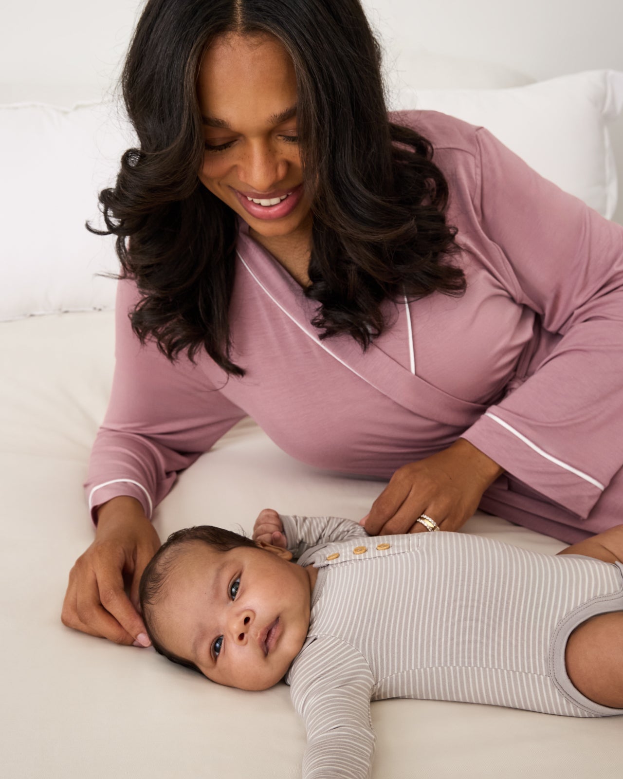 A must-have for mama! This silky soft Lunaluxe® Bamboo Rosewood Robe features a relaxed silhouette with a removable belt and inner tie closure for the perfect fit. The contrast piping adds an elevated touch. while two side pockets keep your essentials close during those sleepy morning feeds. With its tagless design. this dreamy robe is perfect for hospital homecomings. slow Sunday mornings. and matching with your littlest love.