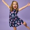 Float like a butterfly! The Royal Butterflies Flutter Twirl Dress with Bodysuit features whimsical pink and purple butterflies your little free spirit will love. Made from durable Soluxe® Bamboo with flutter sleeves and a hidden snappable bodysuit for easy diaper changes. Perfect for special occasions or everyday cuteness.
