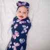 Butterfly kisses and newborn wishes! The Royal Butterflies Swaddle & Luxe Bow Headband Set features whimsical pink and purple butterflies on stretchy Lunaluxe® Bamboo. This layette set includes a versatile baby swaddle blanket and adjustable bow headband that never needs tying. Packaged in our signature peekaboo gift box. it’s perfect for baby showers!