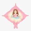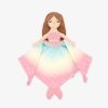 The Serena the Mermaid Sleepyhead Lovey features a sleepy-eyed mermaid plush top. Her hair is blonde and she’s wearing a white shirt. The attached security blanket is a blue. yellow. and pink ombré with a white mermaid scales pattern. One corner of the blanket is a pink mermaid tailfin.