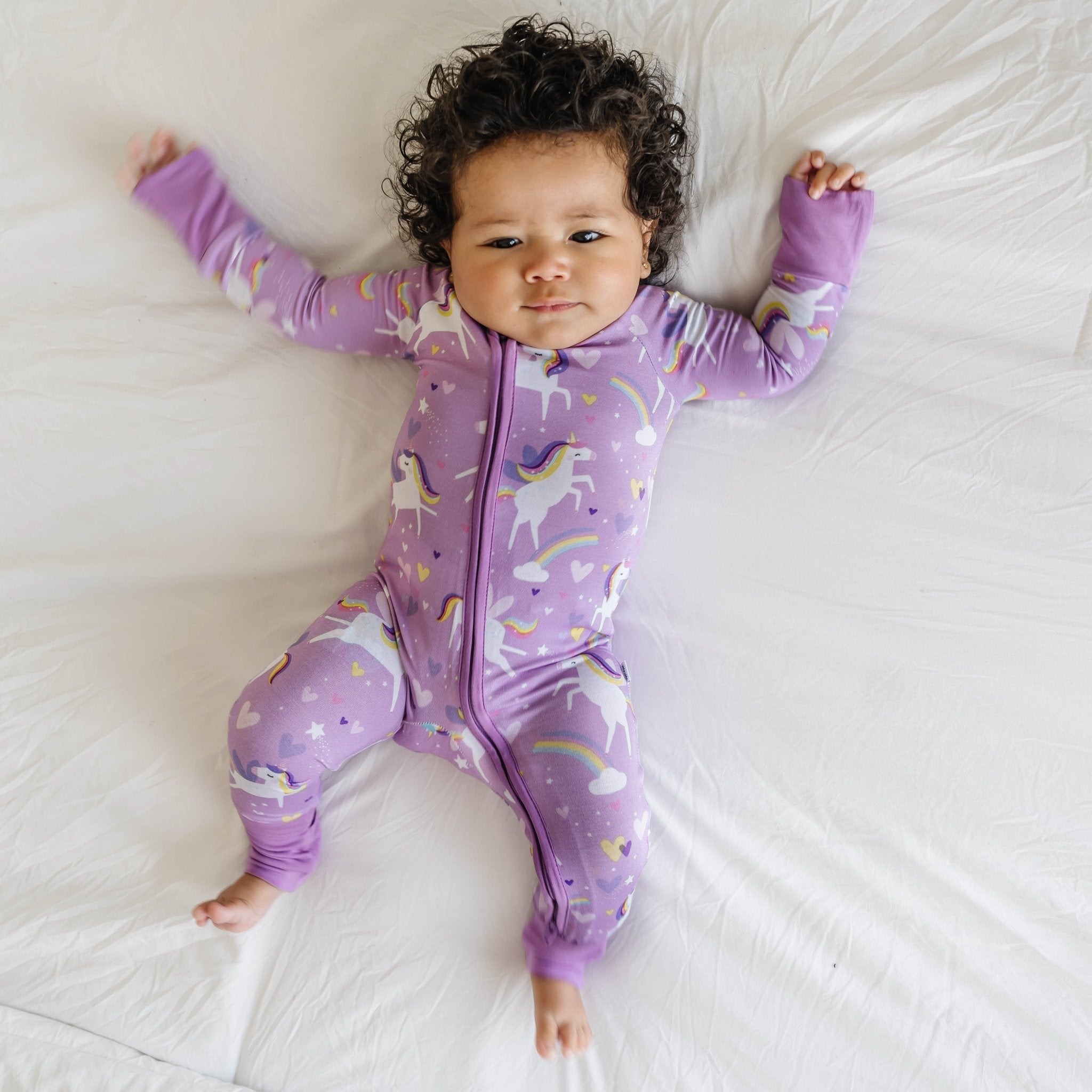Let their imagination soar! Flying unicorns with rainbow-colored manes gallop across a purple background with hearts. stars. and rainbows in this magical print.