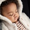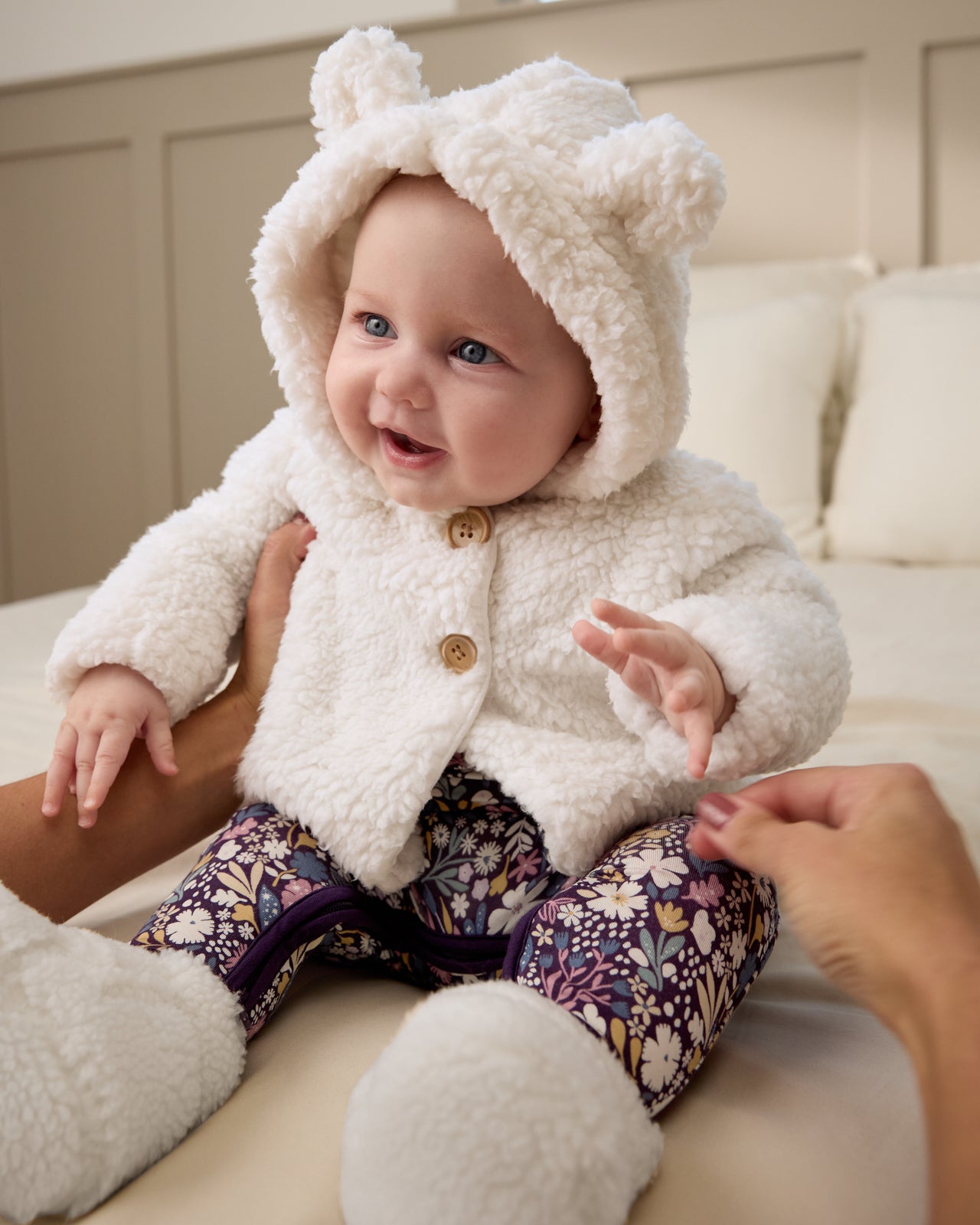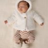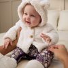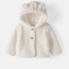 Keep your little cub cozy. This adorable Soft White Sherpa Baby Jacket is a winter essential for baby. Made from the softest bamboo sherpa. complete with two cute buttons. 3D bear ear details and a jersey lining. Bundle them up for winter adventures and get ready for all the awws!