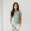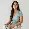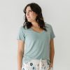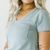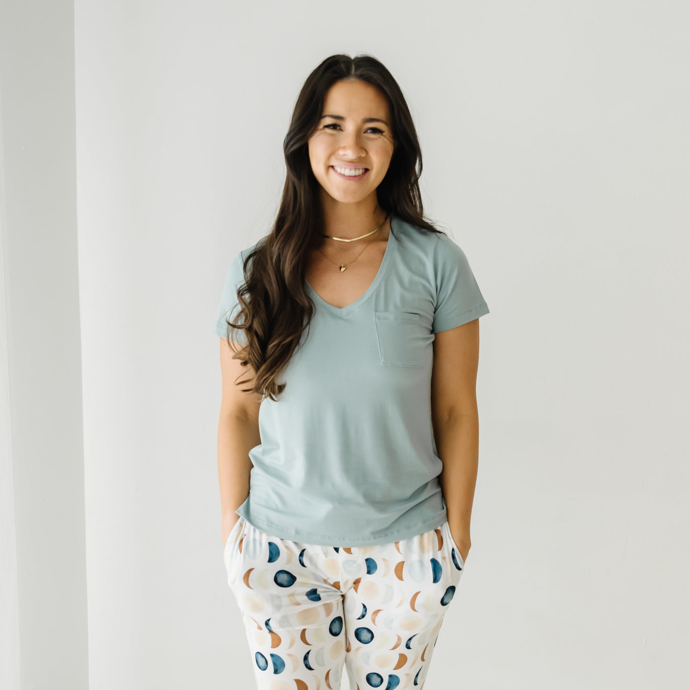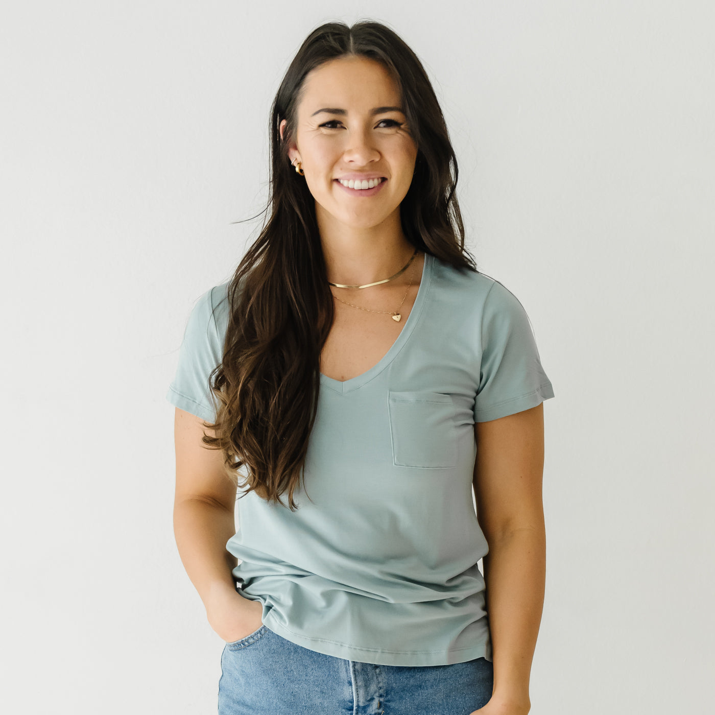 The comfiest tee you’ll ever own! Designed by a mama and made from our buttery soft Lunaluxe? Bamboo in a thicker fabrication. this blue-gray Pocket Tee features a relaxed fit. trendy pocket. and perfect V. It’s super comfy and goes with everything from jeans to PJs. This pocket tee is classic. comfy. and dare we say??perfect.