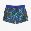 Treetop Tails features an all-over rainforest print with various jungle animals and foliage. such as toucans. parrots. monkeys. and more. The background and trim are royal blue.